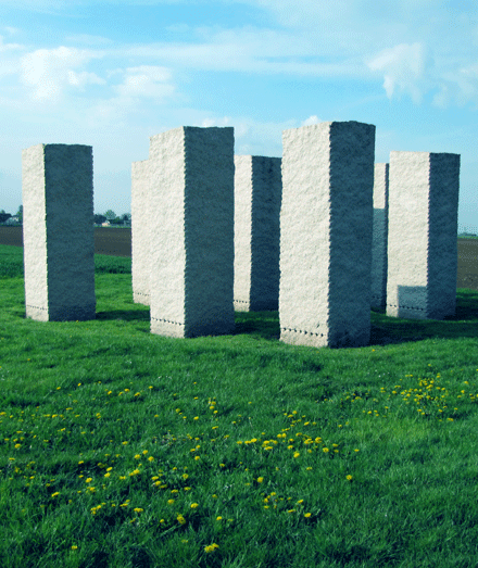Mühsam zieht Andreas Main über die Feldwege, und plötzlich entdeckt er etwas, das er aus Studentenzeiten in Münster kennt: Eine Stele von Ulrich Rückriem. „Mitten in der Pampa… Ich schaue mich um. Ein paar hundert Meter weiter noch mehr Stelen… Eine Gruppe von acht, neun, zehn Steinen. Die Felder drum herum sind kahl. Eine Landmarke. Ein meditativer Ort.“