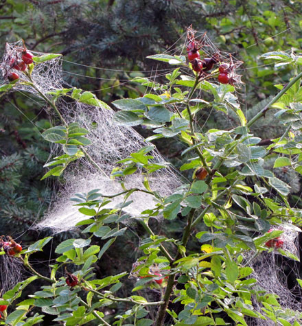 Auch wenn ich eine Frau bin, etwas eitel dazu, gefällt mir der Name „Altweibersommer“, zumal wenn er so prächtig daher kommt wie in diesen Tagen. Wer früh morgens durch die Wälder zieht, wenn noch Feuchtigkeit auf den Zweigen nistet und zarte Nebel schweben, entdeckt Geheimnisvolles. Die Sträucher sind über und über bedeckt mit silbrig gewebten Zelten, die wie Vorboten des Engelshaars wirken, das früher fast jeden Weihnachtsbaum schmückte. Verwunschen, ein wenig verloren wirkt die Welt, wie versteckt unter geheimnisvollen Hauben, in denen die Stille wohnt.