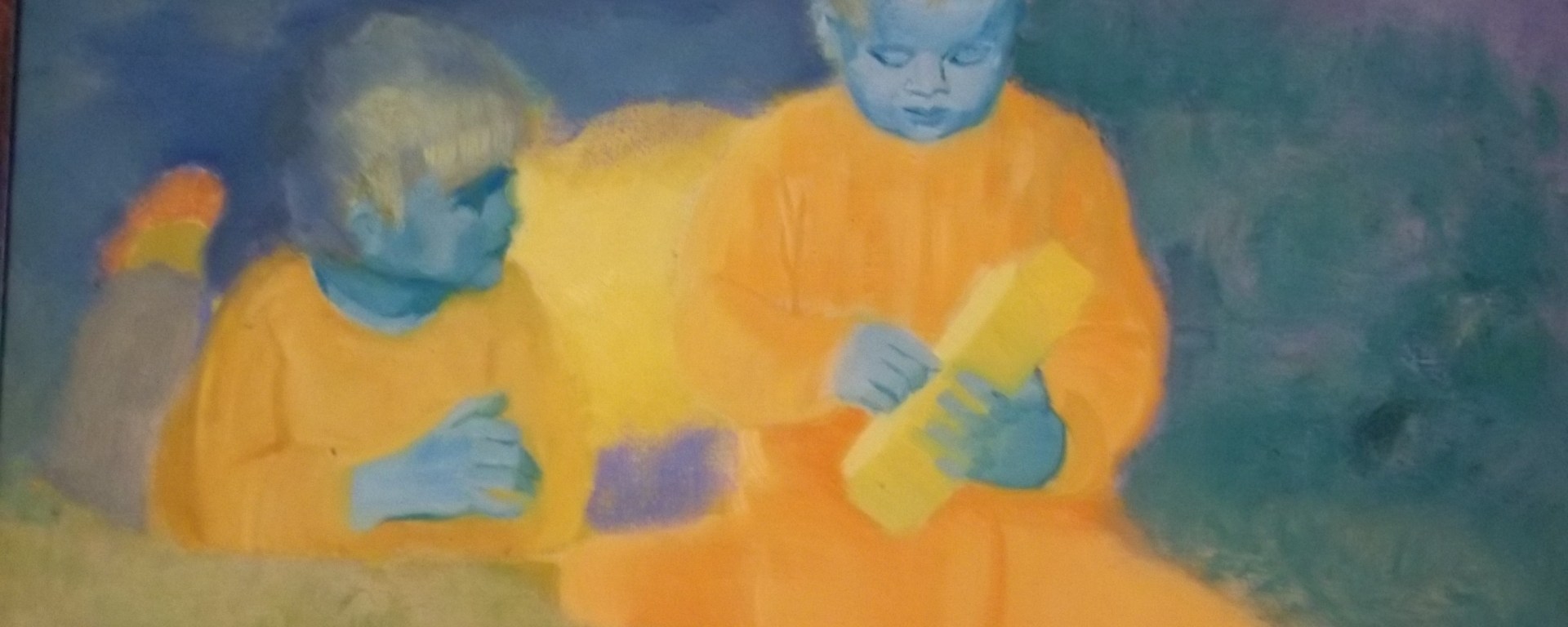 Ein Gemälde, irreal wie ein Traum, gefunden auf einem Flohmarkt in Madrid. Die Leinwand lag in einer Ecke, unbeachtet, scheinbar wertlos. Wir waren sofort interessiert. Diese Kinder: Skizziert erscheinen ihre Körper, die blauen! Gesichter aber sind präzise gemalt, gleichsam lebendig in einer verschwindenden Welt. Womit spielen sie? Was interessiert sie? Das Ding in den Händen gleicht einem altmodischen Handy, aber gab es zu der Zeit, als es gemalt wurde, schon Handys?