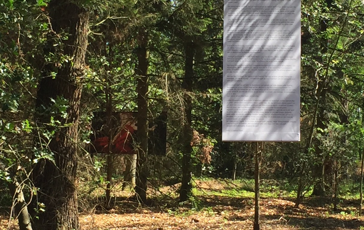 Auch ich durfte als Autorin an der Ausstellung teilnehmen. Mein Schneewittchen ist eine Bloggerin, die sich vor dem Bildschirm verliert und mühevoll nach neuen Wegen sucht. Zwei Wochen lang schwebte meine Geschichte auf einer weißen Fahne im Park. Manchmal war das Licht-und-Schatten-Spiel so intensiv, dass Lesen unmöglich war, manchmal wehte der Wind die Stoffbahn unruhig hin und her, manchmal prasselte Regen auf die Buchstaben.