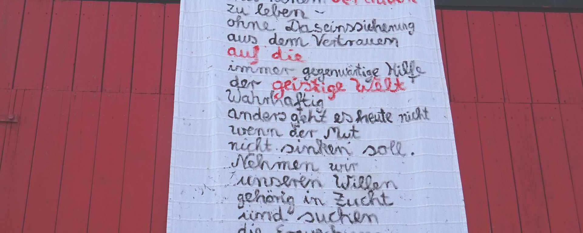 Okay, okay. Ich folge, zumal mir das Leintuch gefällt, das sie vors Atelier gehängt hat – mit einem weiteren Zitat von Steiner: